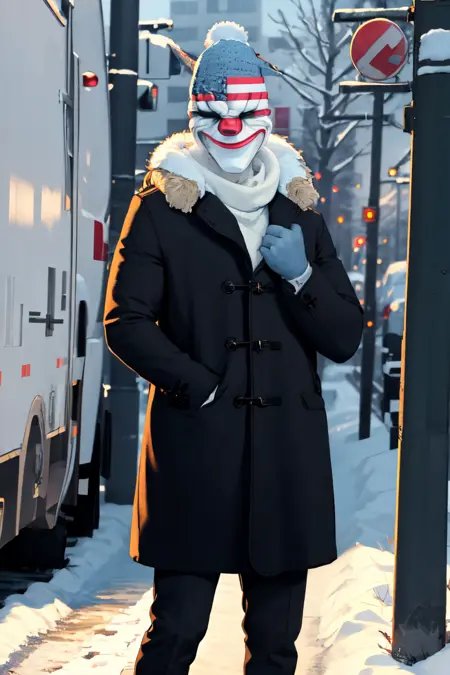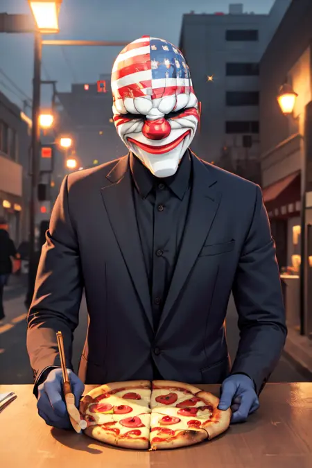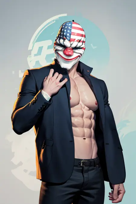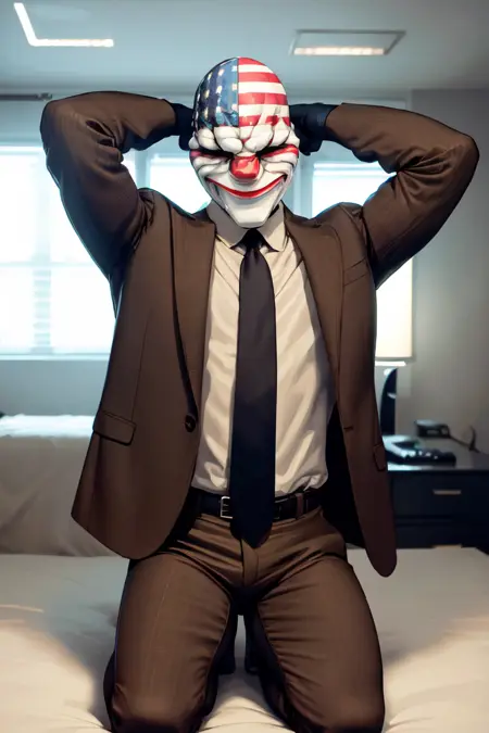 "DallasPD, mask, brown jacket, open jacket, black necktie, suit, formal, gloves, brown pants"
