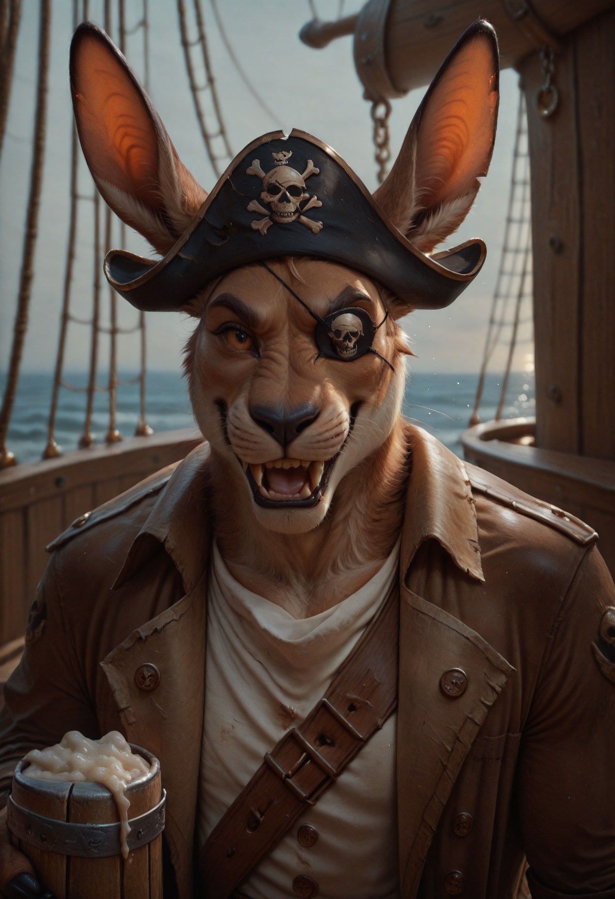 kftenhance, masterpiece, best quality, amazing quality, realistic, 1boy, solo, anthro, furry, cat, pirate captain, evil, fangs, eyepatch, holding sword, pirate ship, paws