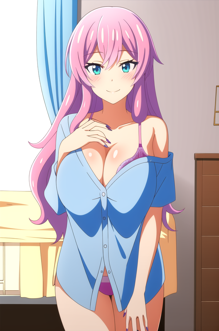 <lora:WatanabeAkari-v1-01:0.8>, ChopioAkari, 长发, 绿眼, 发丝遮眼, 粉色头发, 闪亮头发, (脸红:1.3), 直视观众,