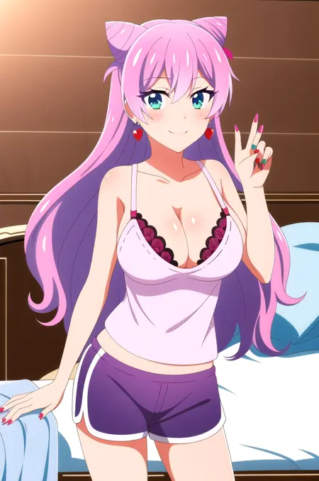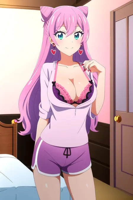 outfit_2, 粉色背心, 红色内衣, 荷叶边内衣, 刺绣, 内衣若隐若现, 海豚短裤, 紫色短裤,