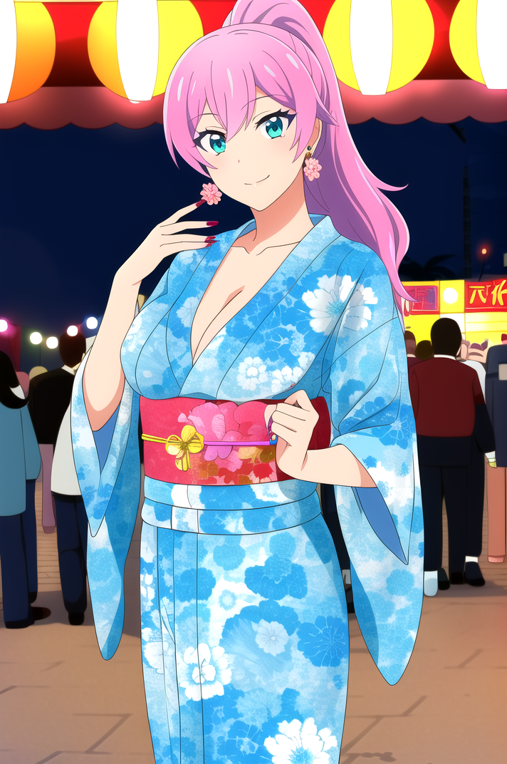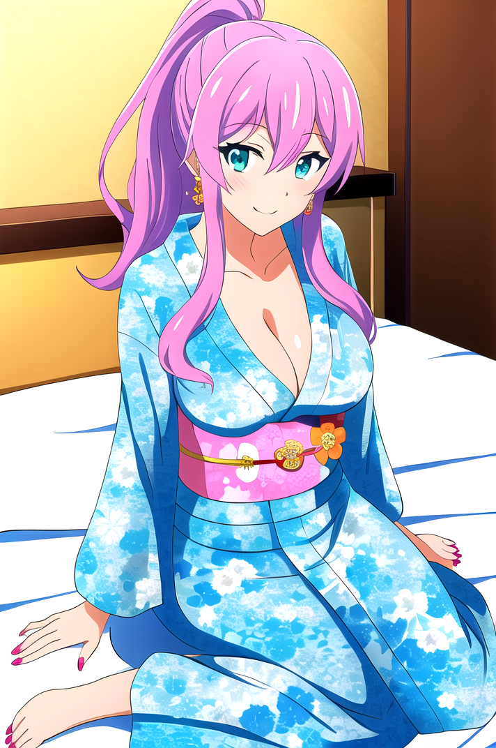 outfit_5, 金色耳环, 蓝色和服, 花卉图案, 长袖, 宽袖, 黄色腰带, 红色丝带,