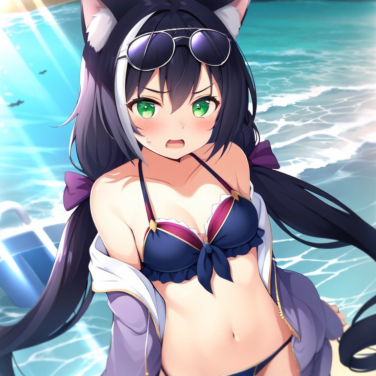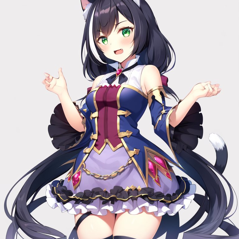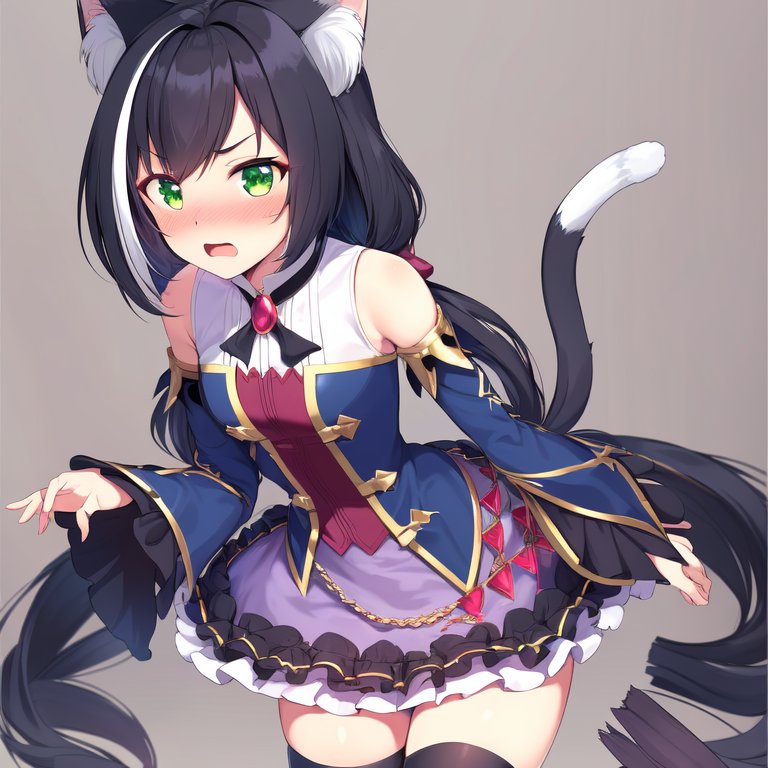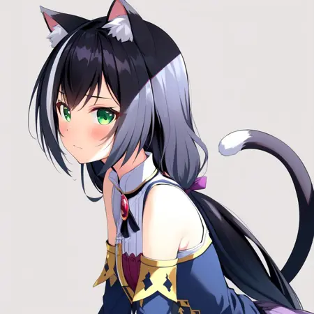 kyaru, black hair, green eyes, cat ears, bare shoulders, detached sleeves, purple skirt