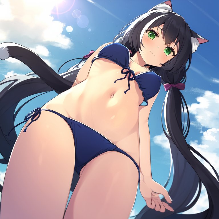 夏服:bare shoulders, detached sleeves, purple skirt を black bikini に置き換え: