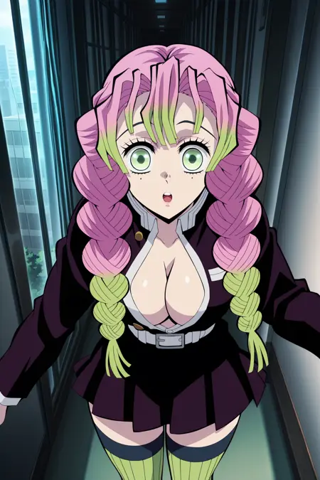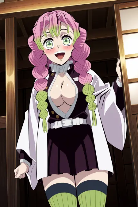 一身黑色鬼杀队制服的蜜璃,鬼杀队制服,胸部露出,部分解开的纽扣,白色腰带,百褶短裙,绝对领域,绿色过膝袜,有纹路的腿部服饰 | 衣服破损
