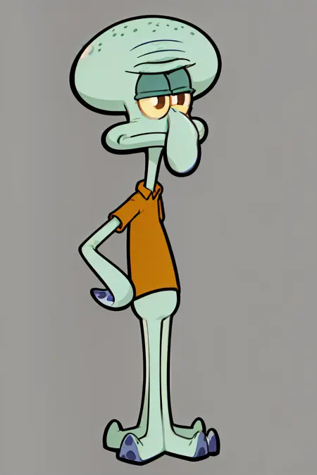 Prompt sample: squidward, solo, simple background, shirt, 1boy, standing, full body, male focus, pokemon (creature), colored skin, black background, lora:squidward-07:1