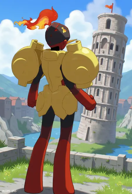 Armarouge. From testing, it seems to work with "armarouge" only, describing the armor helps, but doesn't look like it needs it. You can get outputs without armor by inputting "completely nude", or "in an alternative outfit" and then describing the outfit.