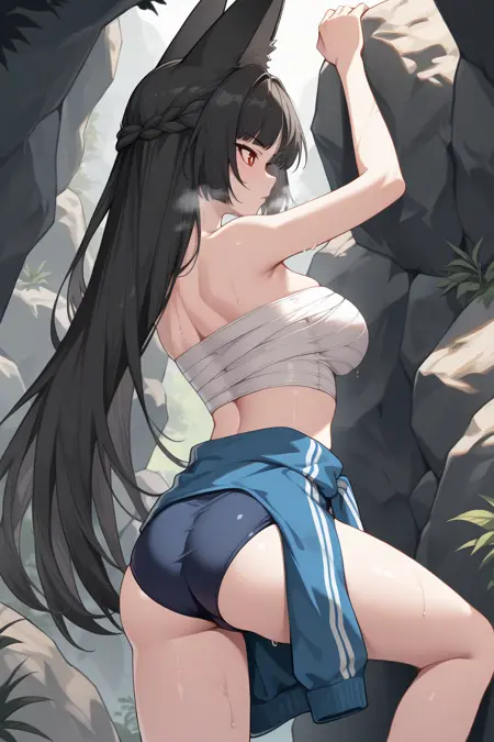 外見:hsmyb、動物の耳、動物の耳のふわふわ、赤い目、白い瞳、明るい瞳、黒髪、長い髪、ストレートな前髪、側髪、ハーフアップの編み込み、中くらいの胸