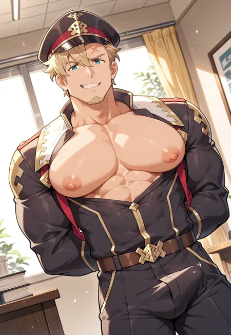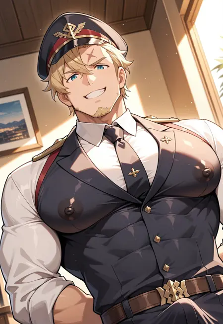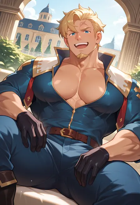 curran, male focus, 1boy, solo, bara, pectorals, muscular, mature male, large pectorals, gloves, goatee, stubble, jewelry, pants, shirt, necklace