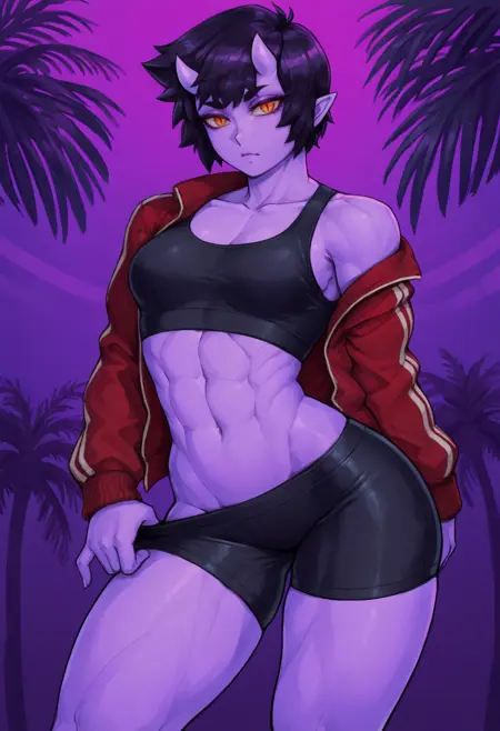「紫の肌、色付きの肌、尖った耳、オレンジの目、縦に細長い瞳孔、鬼の角、肌で覆われた角、短い髪、とげとげした髪、黒い髪、中程度の胸」