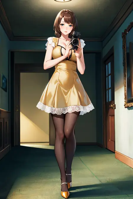 添加 "黄色连衣裙、丝袜、乳沟、高跟鞋" 以呈现她的典型造型。