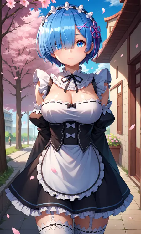 rem、青い目、青い髪、短い髪、片方の目を覆う髪、xヘアオーナメント、花のヘアバンド