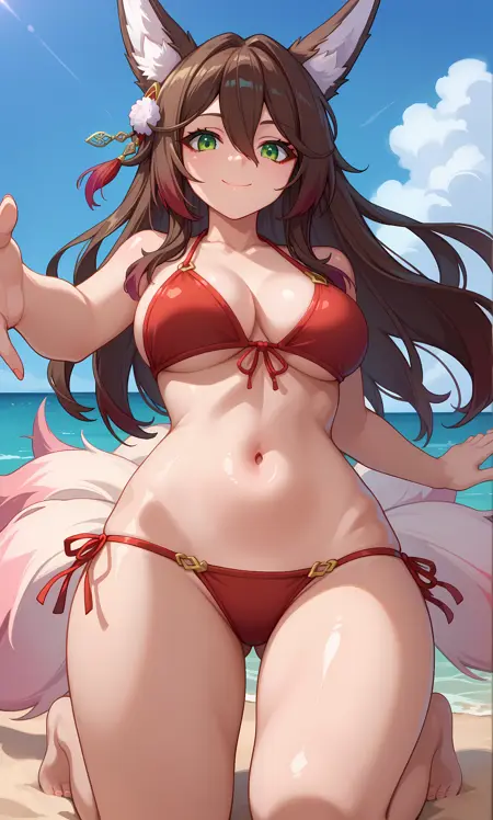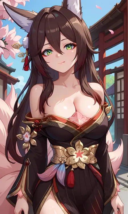 fugue_hsr, green eyes, brown hair, gradient hair, hair ornament, long hair, fox ears, fox tail, multiple tail
