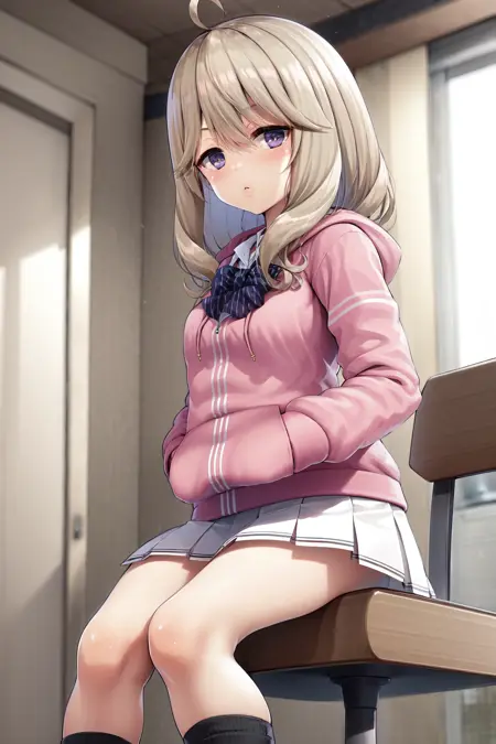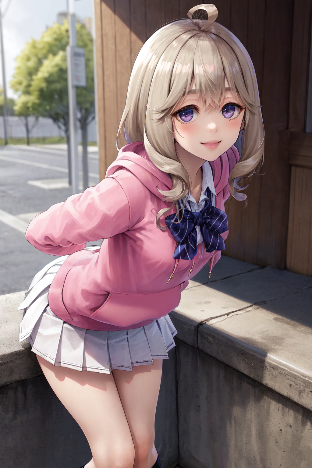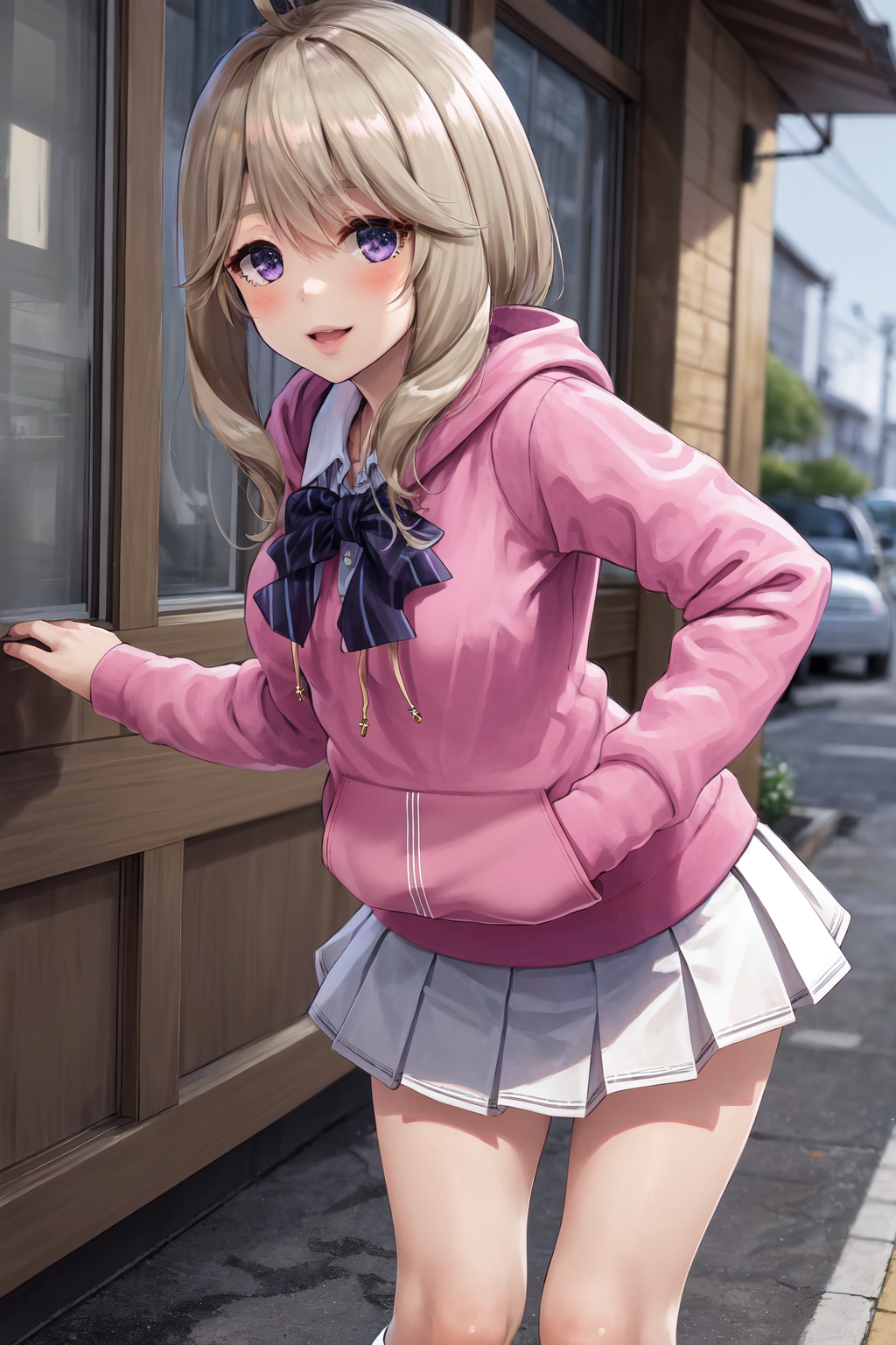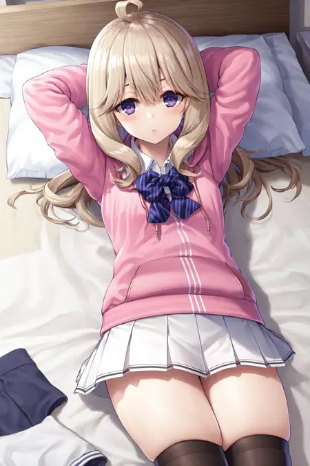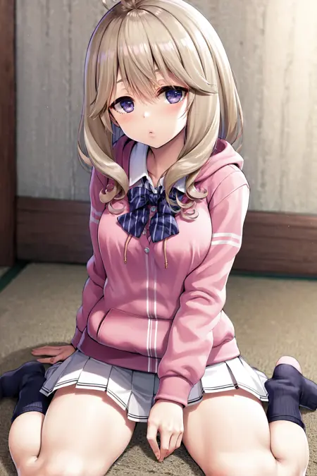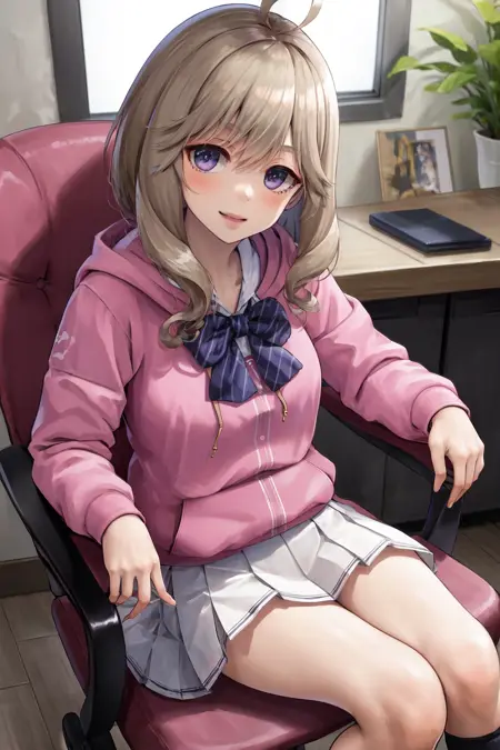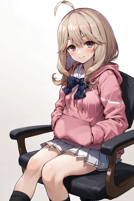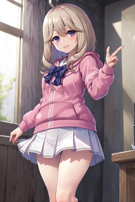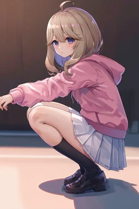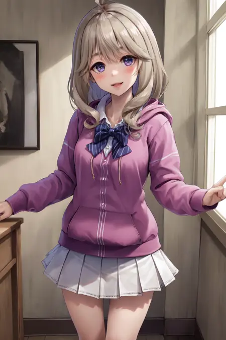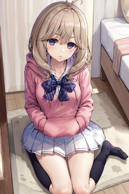 默认服装:白色短裙、粉色连帽衫、蝴蝶结衬衫、黑色长袜