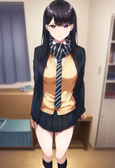 복장 1: 학교uniform, 넥타이, 블레이저, 검은 블레이저, 스웨터, 긴 소매, 손목을 넘는 소매, 벌어진 옷, 스커트, 미니스커트, 주름스커트, 검은 스커트, 로퍼, 양말, 무릎높이 양말, 검은 양말, 신발, 스카프