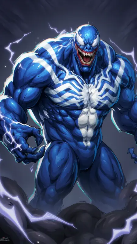 rivals, 에너지로 가득 찬 디지털 일러스트로, 베놈이 등장합니다. 베놈은 근육질의 푸른 피부를 가진 인류형 생물로, 놀라울 정도로 단단한 체형을 가지고 있습니다. 그의 피부는 깊고 전기적인 푸른색이며, 가슴과 팔을 따라 흰색 번개 모양의 줄무늬가 흐르며 원시적인 힘과 에너지를 느끼게 합니다. 그의 머리는 피부색과 일치하는 헬멧 같은 마스크로 덮여 있으며, 날카로운 이빨을 드러낸 사나운 으르렁거리는 미소를 짓고 있습니다. 베놈의 눈은 악랄하고 위협적인 붉은 빛으로 빛납니다.