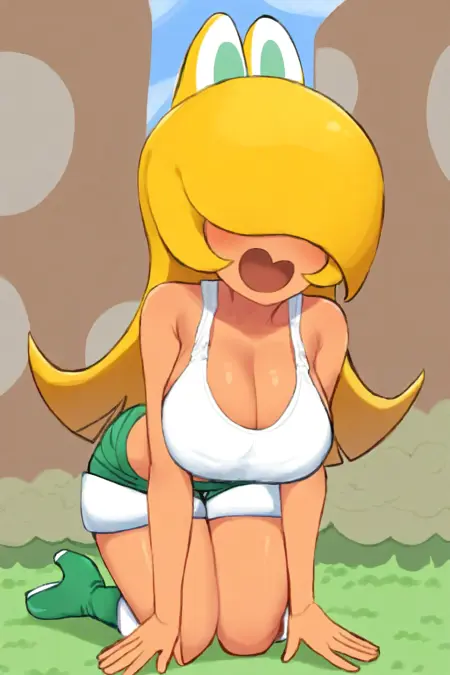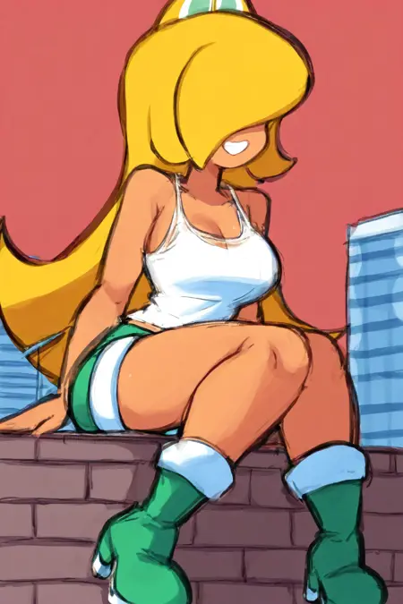 도움이 되는 키워드: 1girl, 탱크탑, 반바지, 부츠, 눈 위의 머리카락/녹색 눈