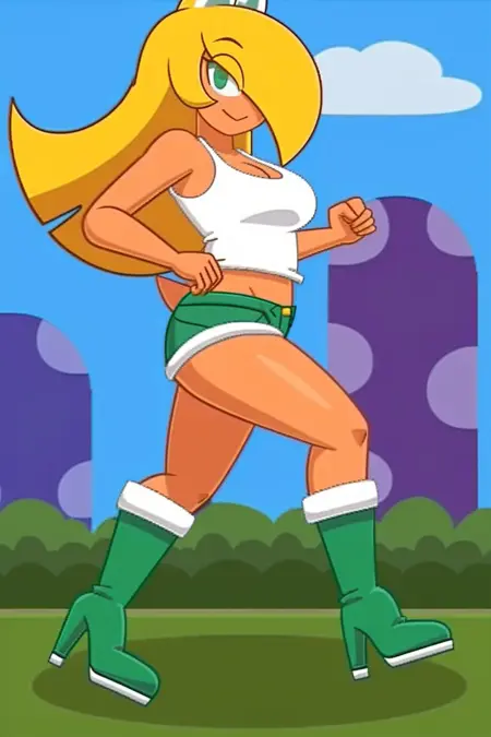 Helpful: 1girl, tank top, shorts, boots, hair over eyes/hair over eye/green eyes,