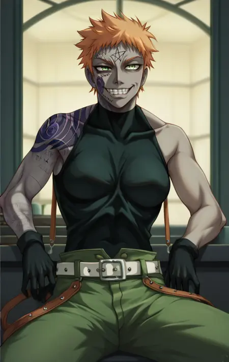 ,ZorinBlitz,short hair,orange hair,spiky hair,green eyes,white belt,pentagram,star,facial mark,black tank top,bare shoulders,green pants,brown suspenders,glove,tattoo,arm tatto,evil grin,grey skin,muscular,r