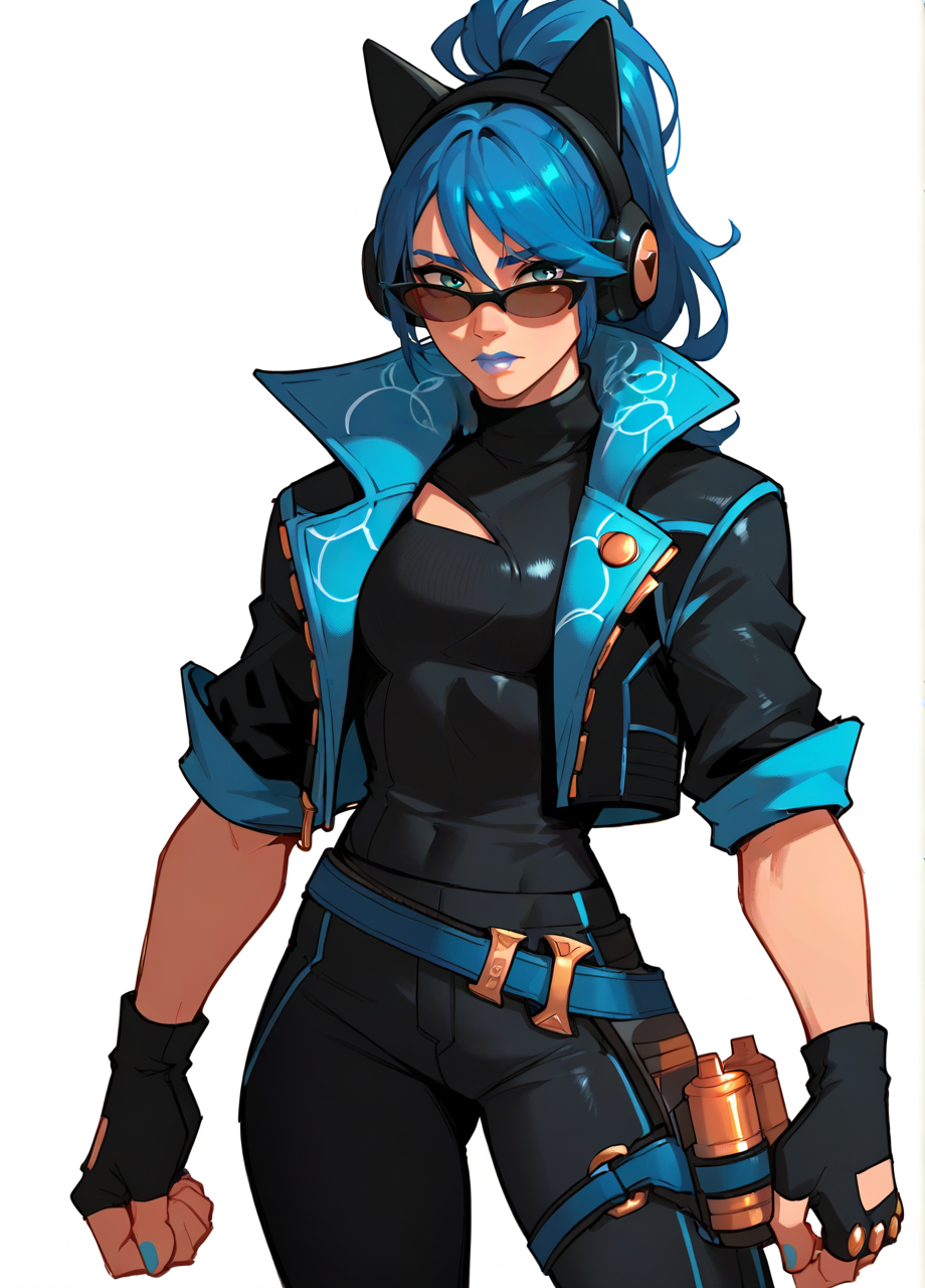 herohope, open jacket, turtleneck, clothing cutout, sleeves rolled up, fingerless gloves, thigh holster, pants | cat ear headphones, sunglasses