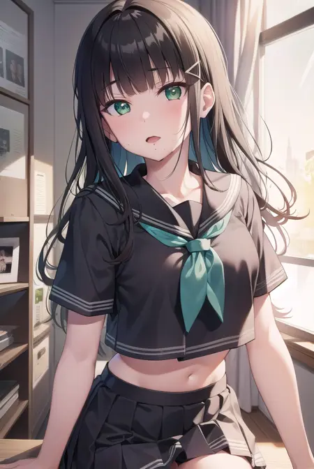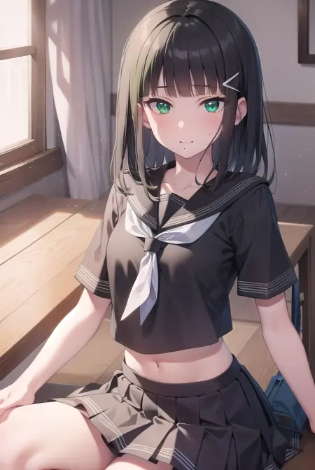 dia kurosawa, 黒髪, (緑色の目:1.5), まっすぐな前髪, 灰色のスカート, 髪飾り, ヘアクリップ, ほくろ, 口の下のほくろ, 長髪,