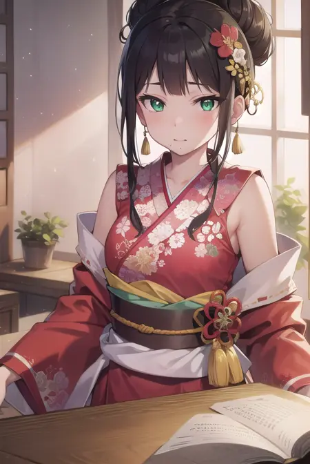 着物: クラビ骨, 花柄の背景, 花柄プリント, フリル付きの袖, フリル, 髪飾り, 髪止め, 髪チューブ, 頭飾り, 日本の衣装, 着物, my mai tonight, 帯, バンド, てっぺんの髪, 単一の髷,