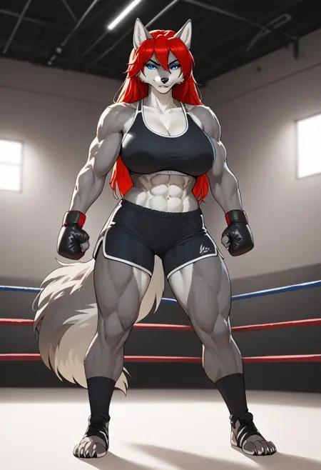 Luka Cross, wolf, female, 1girl, solo, red hair, long hair, gray fur, blue eyes, huge breasts, muscular, abs, tall, tail,