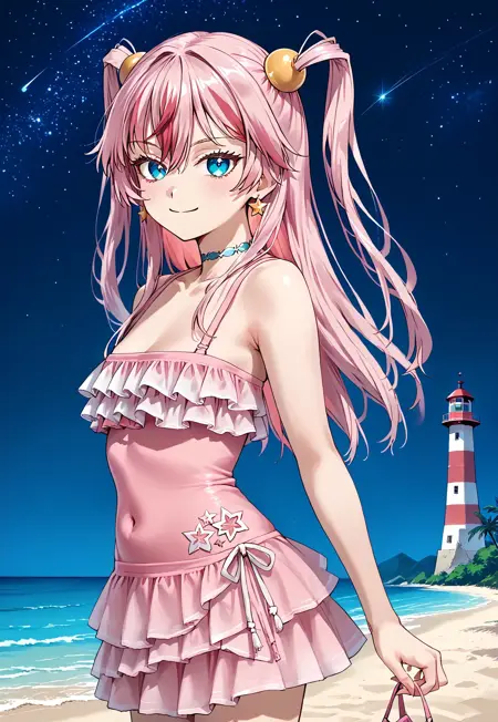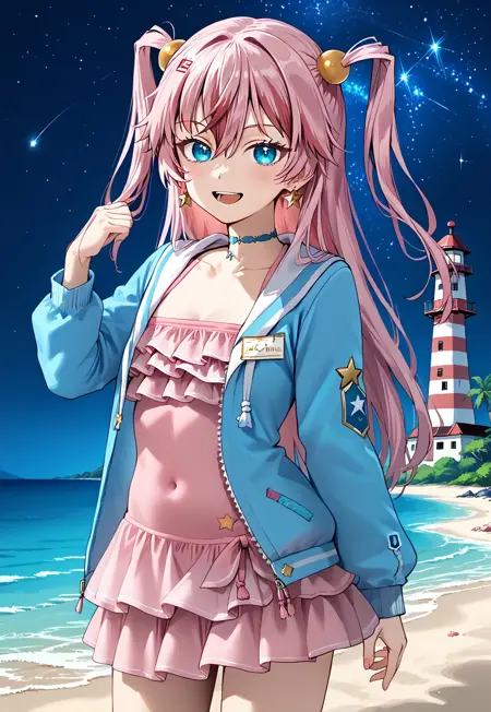 + Ebi1st, 긴 머리, 파란 눈, 분홍색 머리, 머리 장식, 다채로운 머리, 양쪽 위로 올린 머리, 재킷, 초커, 앞머리, 줄무늬 머리, 쇄골, 귀걸이, 흰색 재킷, 수영복, 드레스, 프릴, 열린 재킷, 긴 소매, 분홍색 원피스 수영복, 어깨 노출, 머리볼, 빨간 머리, 눈 사이의 머리, 분홍색 드레스, 배꼽 가린,