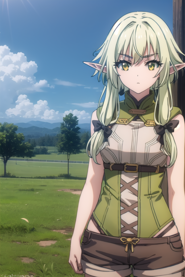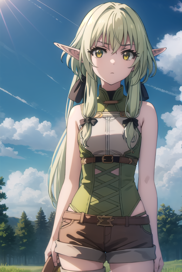 高等精灵弓箭手,精灵,(绿色眼睛:1.5),绿发,发丝间于双眼,长发,尖耳,侧发,(小胸:1.2),