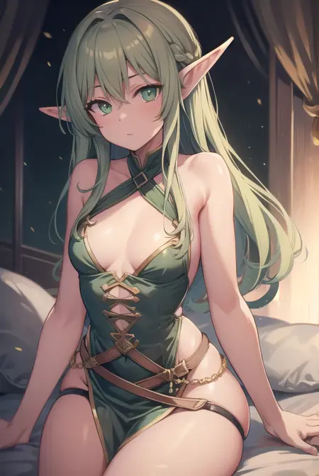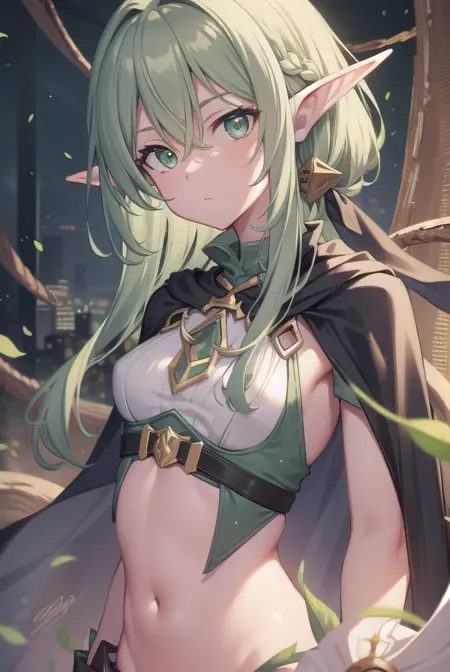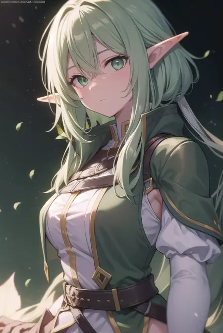 high elf archer, elf, (green eyes:1.5), green hair, hair between eyes, long hair, pointy ears, sidelocks, (small breast:1.2),