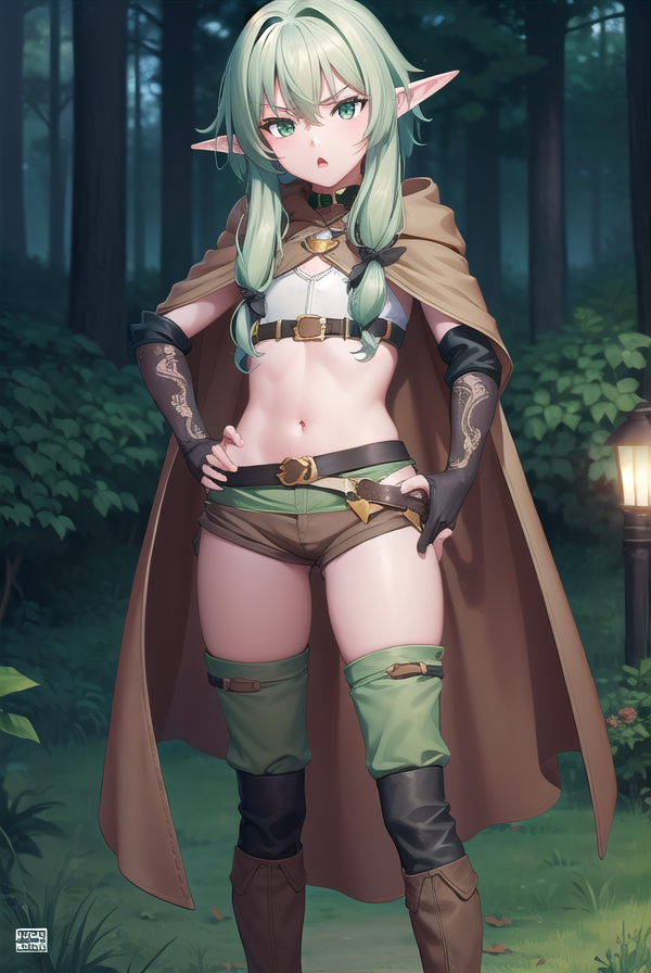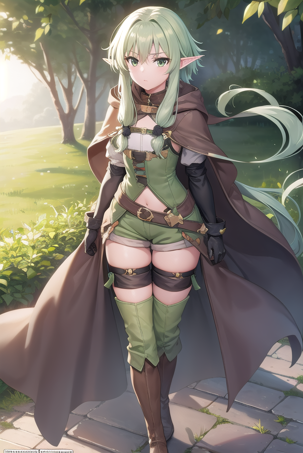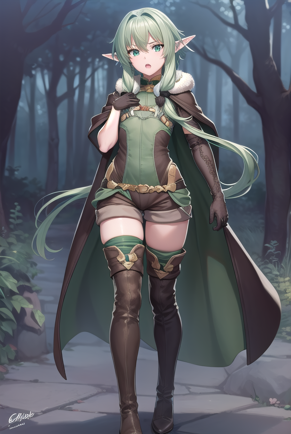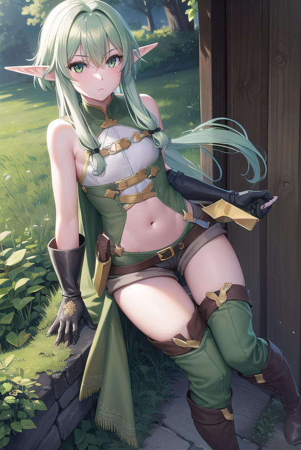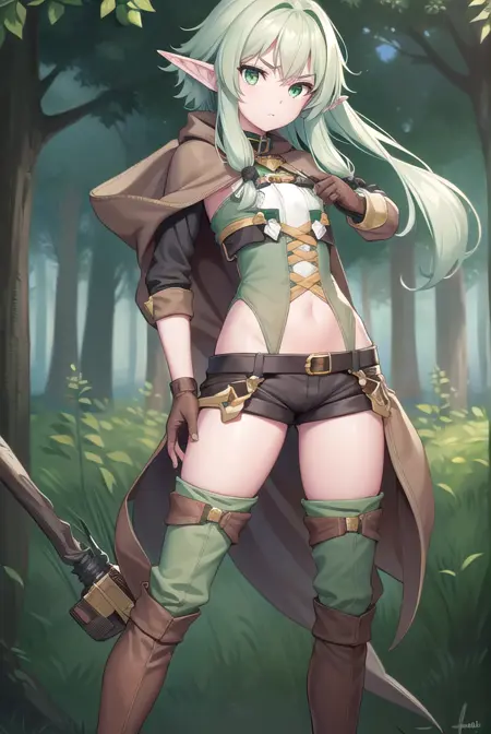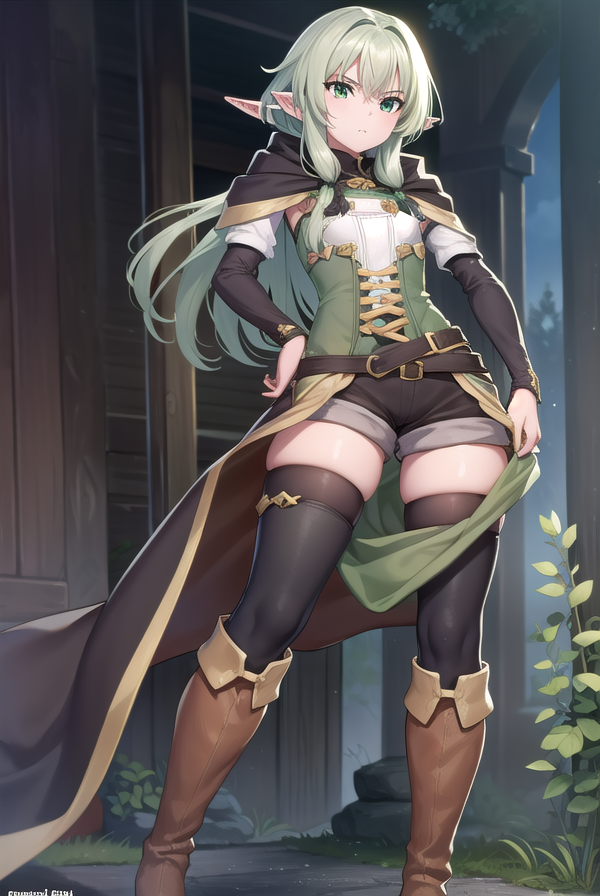 비대칭 옷, 부츠, 겉옷, 엘프, 장갑, 녹색 허벅지 스타킹, 하이힐, 반바지, 허벅지 스타킹,