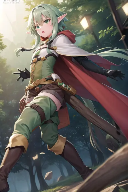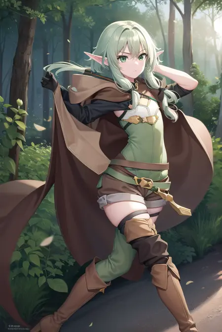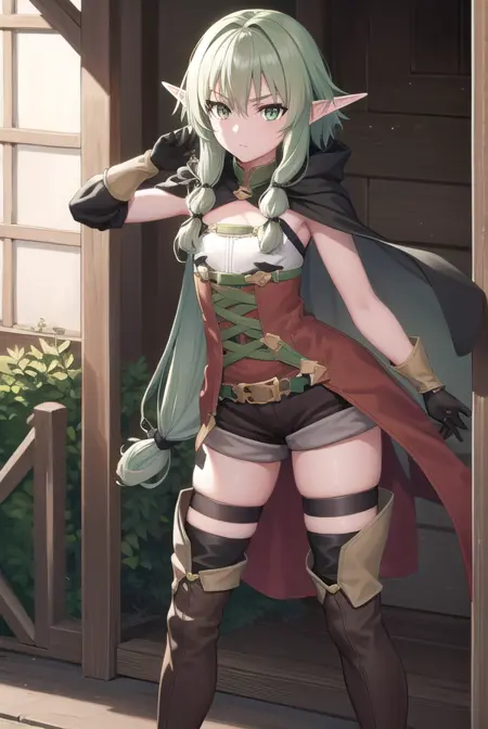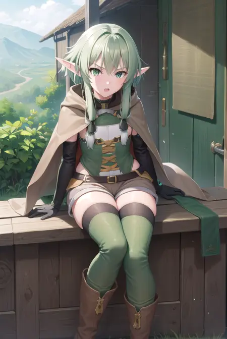 asymmetrical clothes, boots, cloak, elf, gloves, green thighhighs, high heels, shorts, thighhighs,