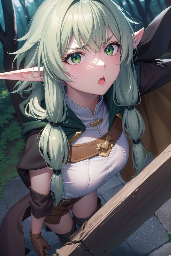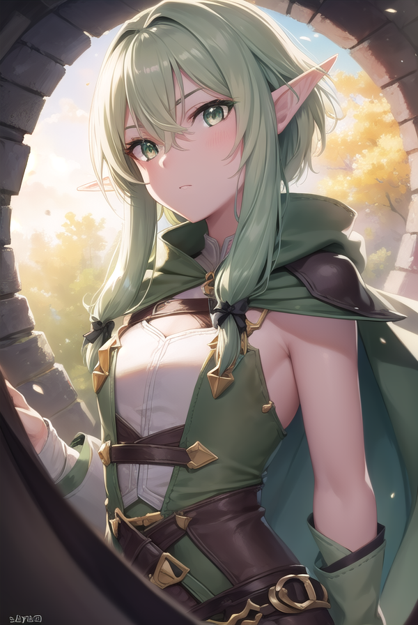 하이 엘프 화살촉, 엘프, (녹색 눈:1.5), 녹색 머리카락, 눈 사이의 머리카락, 긴 머리카락, 뾰족한 귀, 측두부 머리카락, (작은 가슴:1.2),