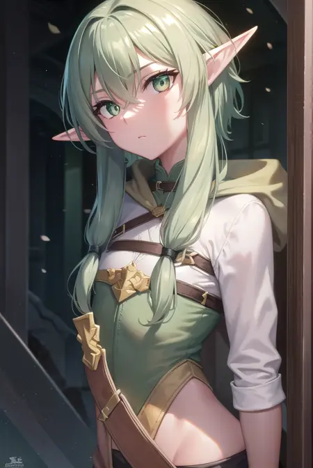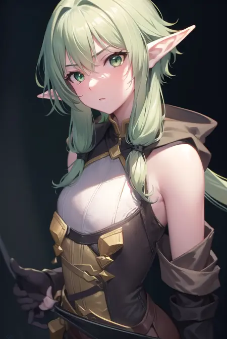 high elf archer, elf, (green eyes:1.5), green hair, hair between eyes, long hair, pointy ears, sidelocks, (small breast:1.2),