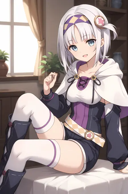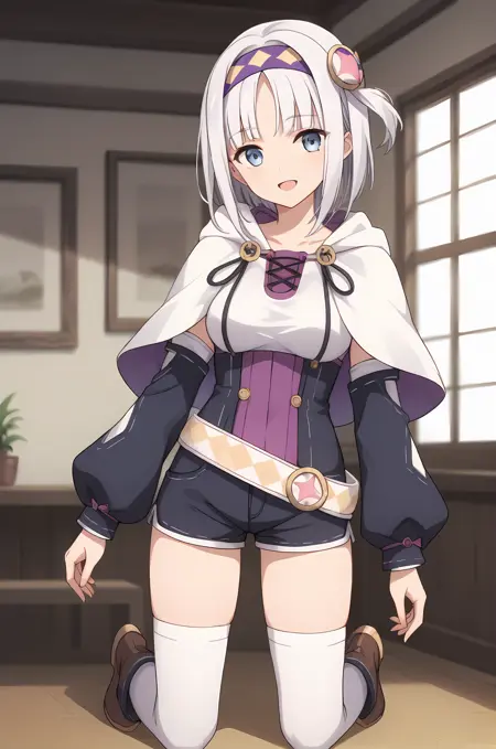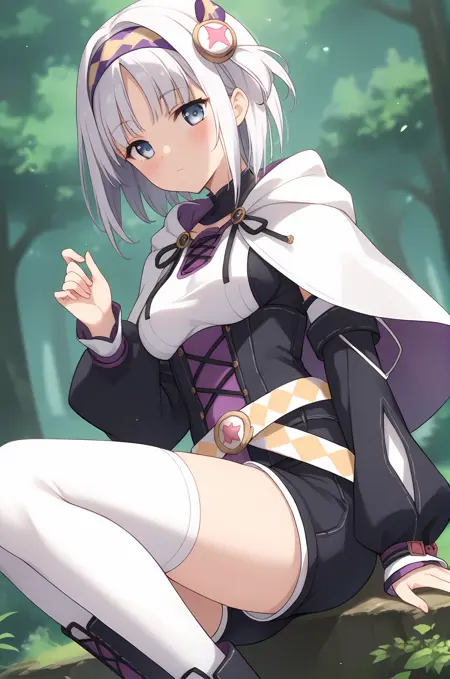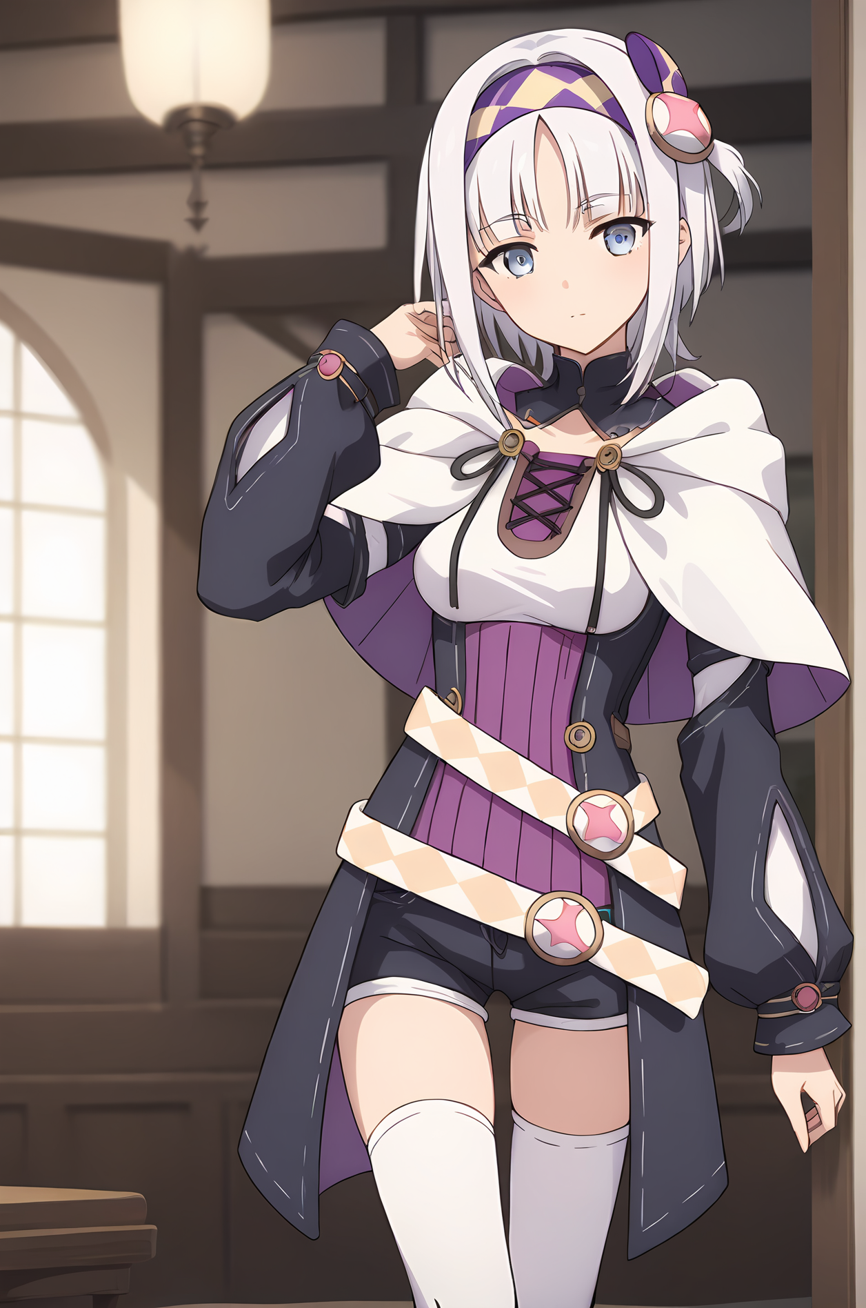 白いキャプリーヌ、紫のコルセット、長袖、ショートパンツ、白いシンクタイハイズ、レッグウォーマー、ブーツ、ベルト