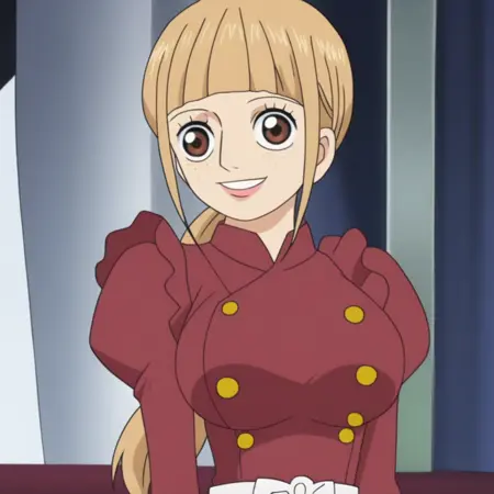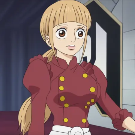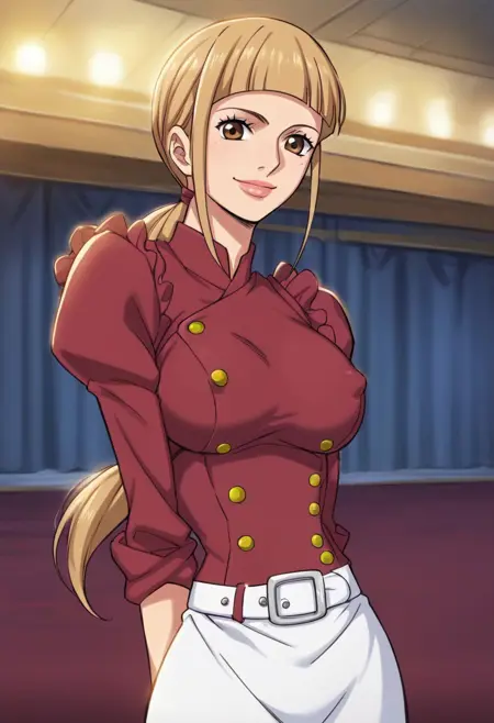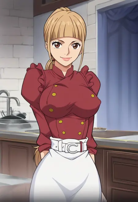CosetteOP, 1girl, solo, light brown hair, brown eyes, freckles, lips, ponytail, large breast, long hair, blunt bangs, dark red bordeaux shirt, white knee-length skirt, chef's uniform, buttons, puffy sleeves, sleeves rolled up, white belt, bow tie on belt,