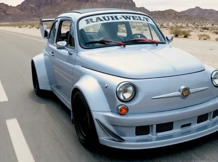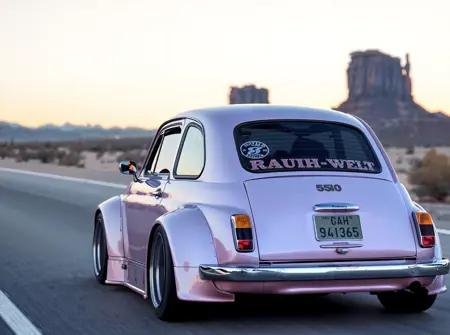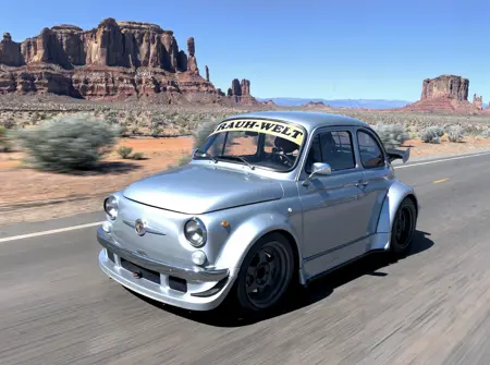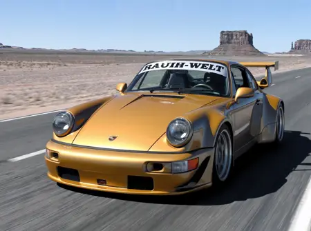 프롬프트에 단순히 "rauh-welt"를 사용하세요. 필요하다면 "와이드바디 키트, 넓은 휀더" 및 "윈드실드 위에 "RAUH-WELT"라고 쓰인 스티커"와 같은 내용을 추가할 수 있습니다.