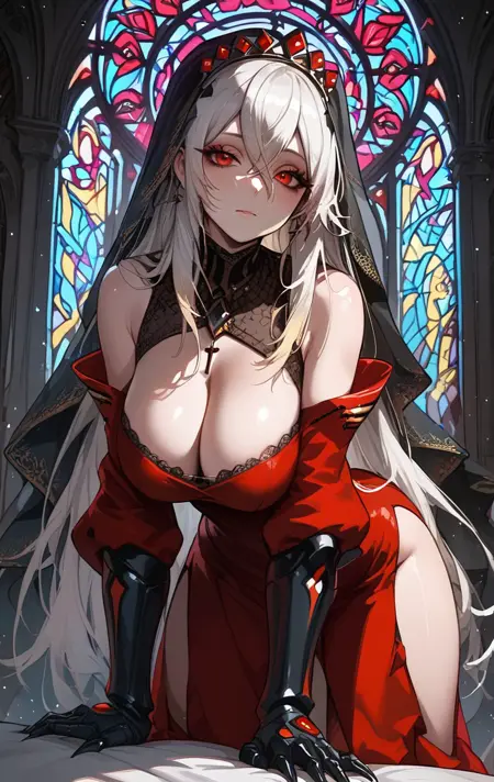 | Trained Words | k4r3zi4, 1girl, solo, long hair, breasts, looking at viewer, bangs, large breasts, red eyes, dress, cleavage, hair between eyes, closed mouth, white hair, multicolored hair, clothing cutout, red dress, cleavage cutout, gauntlets, veil, claws, colored sclera, multicolored eyes, nun, stained glass, red pupilsCopied! |