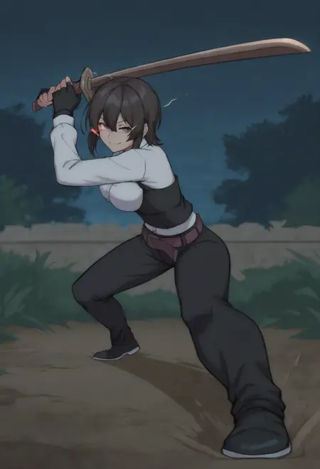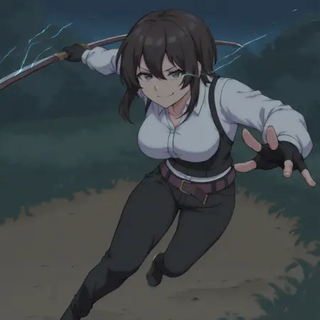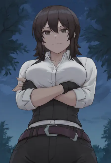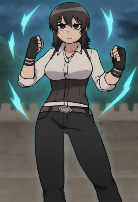 Clothes tags: white shirt, dress shirt, underbust, black gloves, fingerless gloves, belt, black pants, black footwear