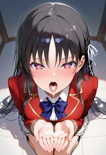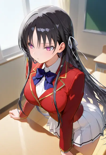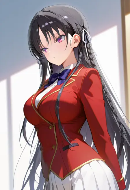 horikita suzune,long hair,black hair,hair ribbon,ribbon,braid,white ribbon,Colored pupils,red eyes,purple eyes,