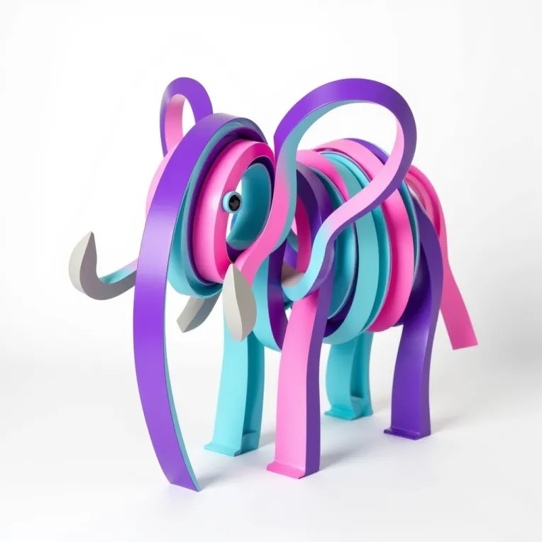 一幅生动而抽象的3D艺术作品,描绘了圣诞老人牵着他的驯鹿散步的场景。圣诞老人和驯鹿均由紫色、蓝色、粉色、黄色和青绿色的多色丝带交织而成。人物的球形头部与其丝带状的身体形成对比,而狗也体现了相同的俏皮丝带设计。连接他们的牵引绳是一条简单的红色线条。场景以白色雪地和宇宙微粒为背景,突出了色彩丰富、充满奇思妙想的设计。