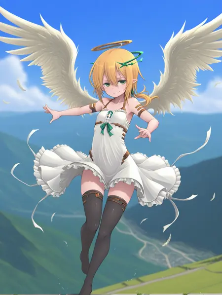 샌달폰, 금발, (녹색 눈), 뾰족한 귀, 낮은 포니테일, 환상, 검정색, 검정색 허벅지 양말, 날개, 천사 날개, 골반 플레이트, 보석,