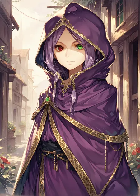 IdunnDivine,heterochromia,red eye,green eye, green dress, single braid, hooded cape,