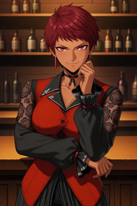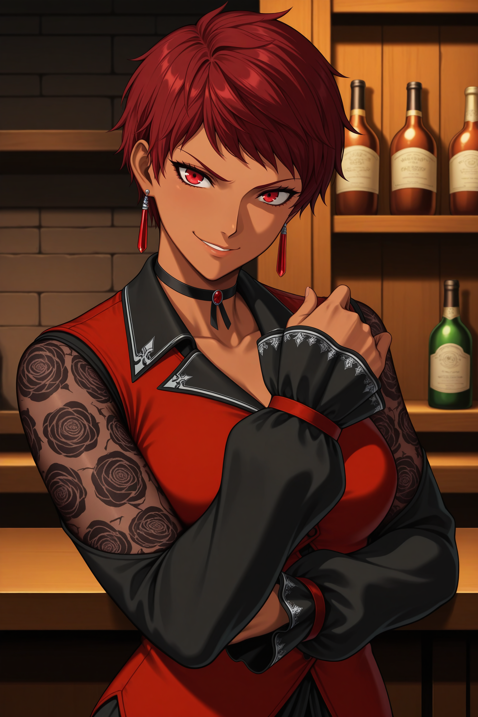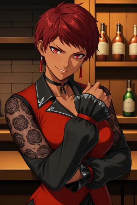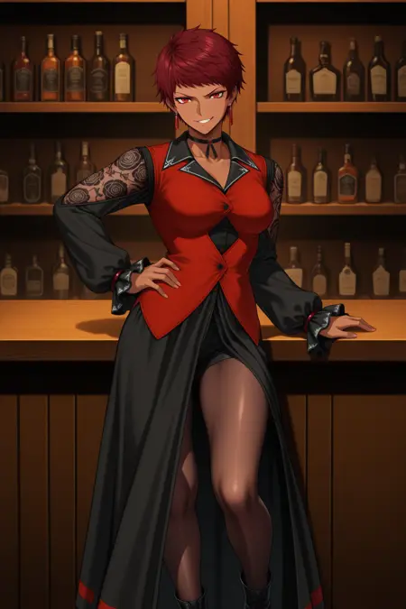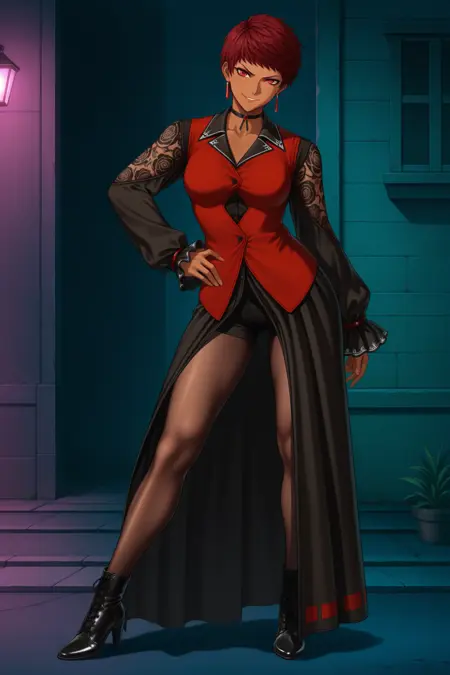vice (kof), 红发, 短发, 红眼, 深色皮肤女性, 红色耳环, 黑色连衣裙, 长裙, 长袖, 项圈, 红色背心, 衣服镂空, 网状袖子, 荷叶边袖子, 前开叉, 黑色长筒袜, 短裤下的长筒袜, 黑色短裤, 超短裤, 黑色鞋履, 高跟靴