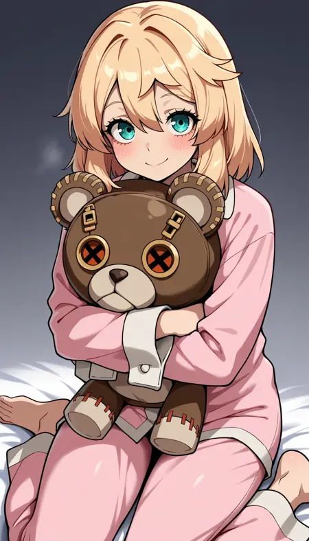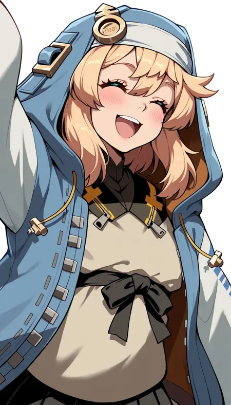 Trigger: 1boy, male focus, blonde hair, otoko no ko, bridget (guilty gear), medium hair, aqua eyes, hooded jacket, hood up, habit, fingerless gloves, open clothes, black gloves, open hoodie, black skirt, puffy long sleeves, pleated skirt