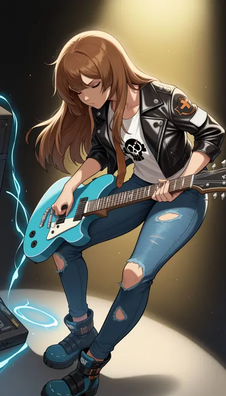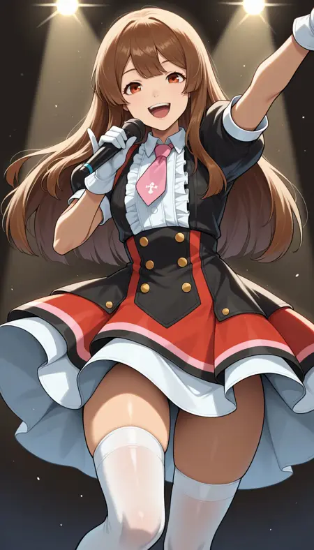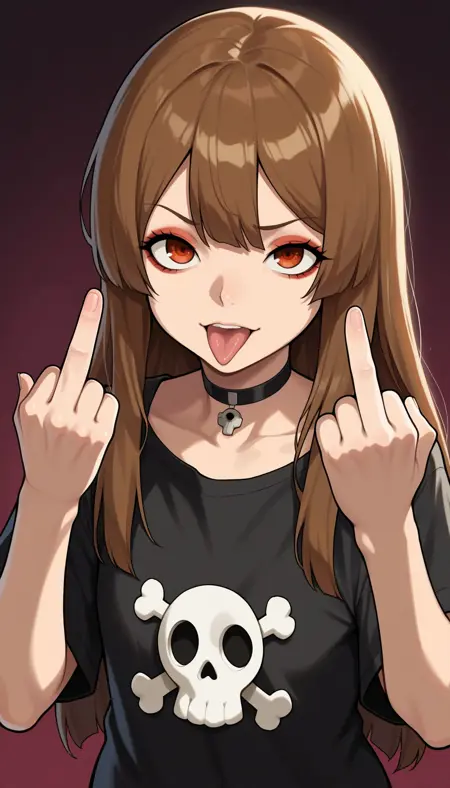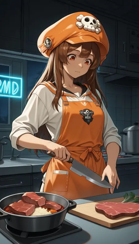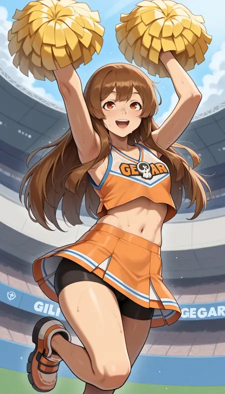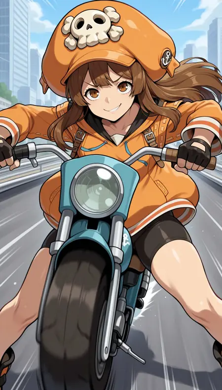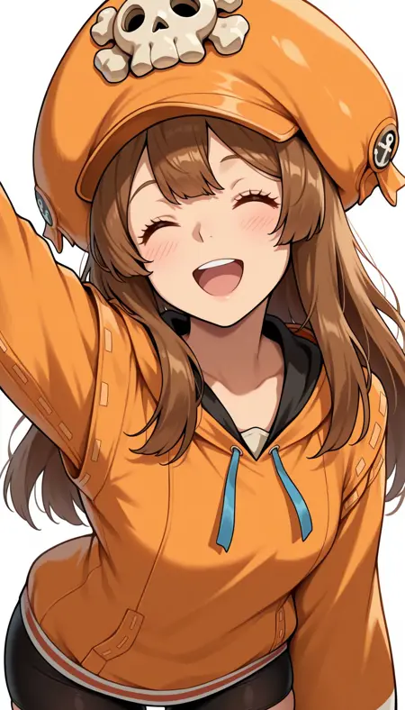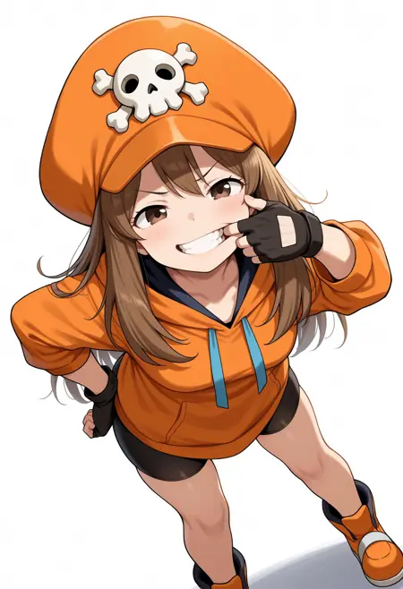 Trigger: 1girl, long hair, orange headwear, brown hair, skull and crossbones, hood, orange hoodie, fingerless gloves, black gloves, bike shorts, brown eyes, black shorts, long sleeves, cabbie hat, pirate hat