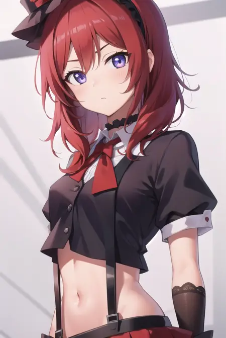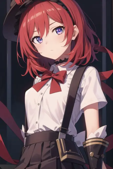 偶像:黑色头饰, 黑色过膝袜, bokura wa ima no naka de, 蝴蝶结, 领结, 项圈, 露指手套, 花边过膝袜, 花边, 手套, 半裙, 帽子, 发带, 小帽子, 肚脐, 红色蝴蝶结, 红色手套, 红发, 衬衫, 短袖, 裙子, 吊带裙, 吊带, 过膝袜, 白色衬衫