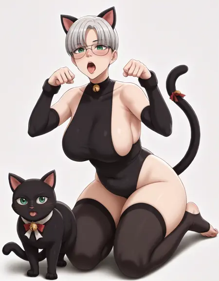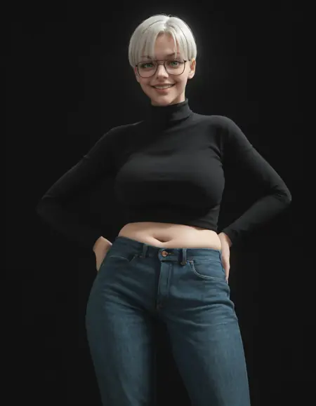 以下のトリガーを使用してください:leon kim, 1girl, solo, short hair, white hair, bangs, green eyes, glasses, chubby body,