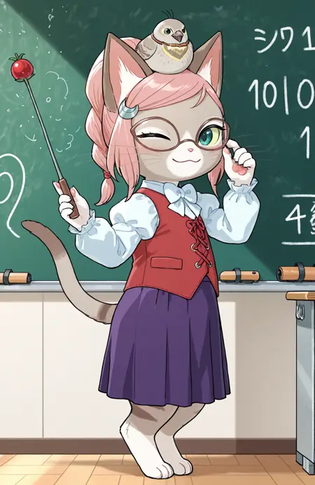 For her teacher appearance, use: TsukinoSensei, furry female, felyne, tan fur, brown stripes, two tone fur, pink hair, green eyes, yellow sclera, cat tail, digitigrade, red vest, white shirt, juliet sleeves, purple skirt, braided ponytail, swept bangs, hair ornament, glasses, pointer,