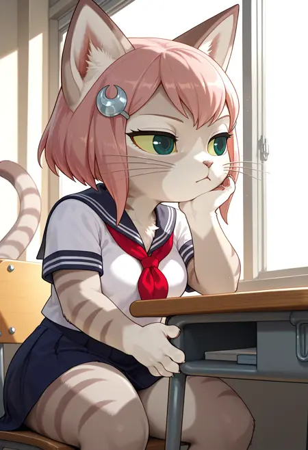 要呈现她的教师形象,请使用:TsukinoSensei,毛茸茸的女性,Felyne,浅棕色毛发,棕色条纹,双色毛发,粉色头发,绿色眼睛,黄色眼白,猫尾,趾行性,红色背心,白色衬衫,朱丽叶袖,紫色裙子,编成马尾,刘海垂落,发饰,眼镜,教鞭