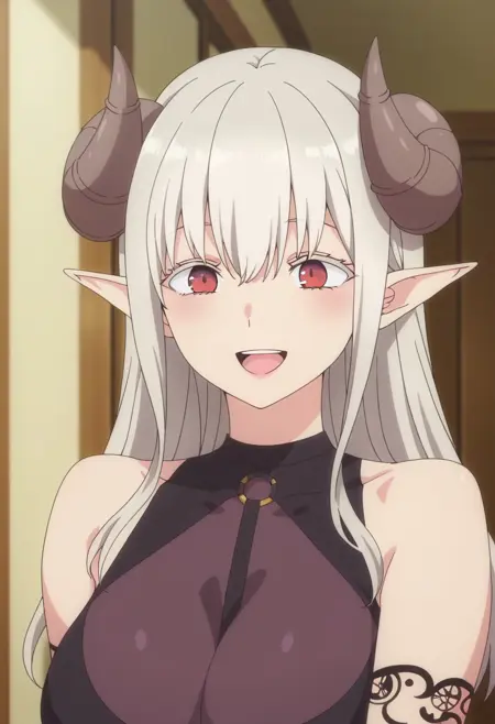 Cosplay as Lustalotte: hanyu mayuri, long hair, grey hair, red eyes, horns, pointy ears, demon girl